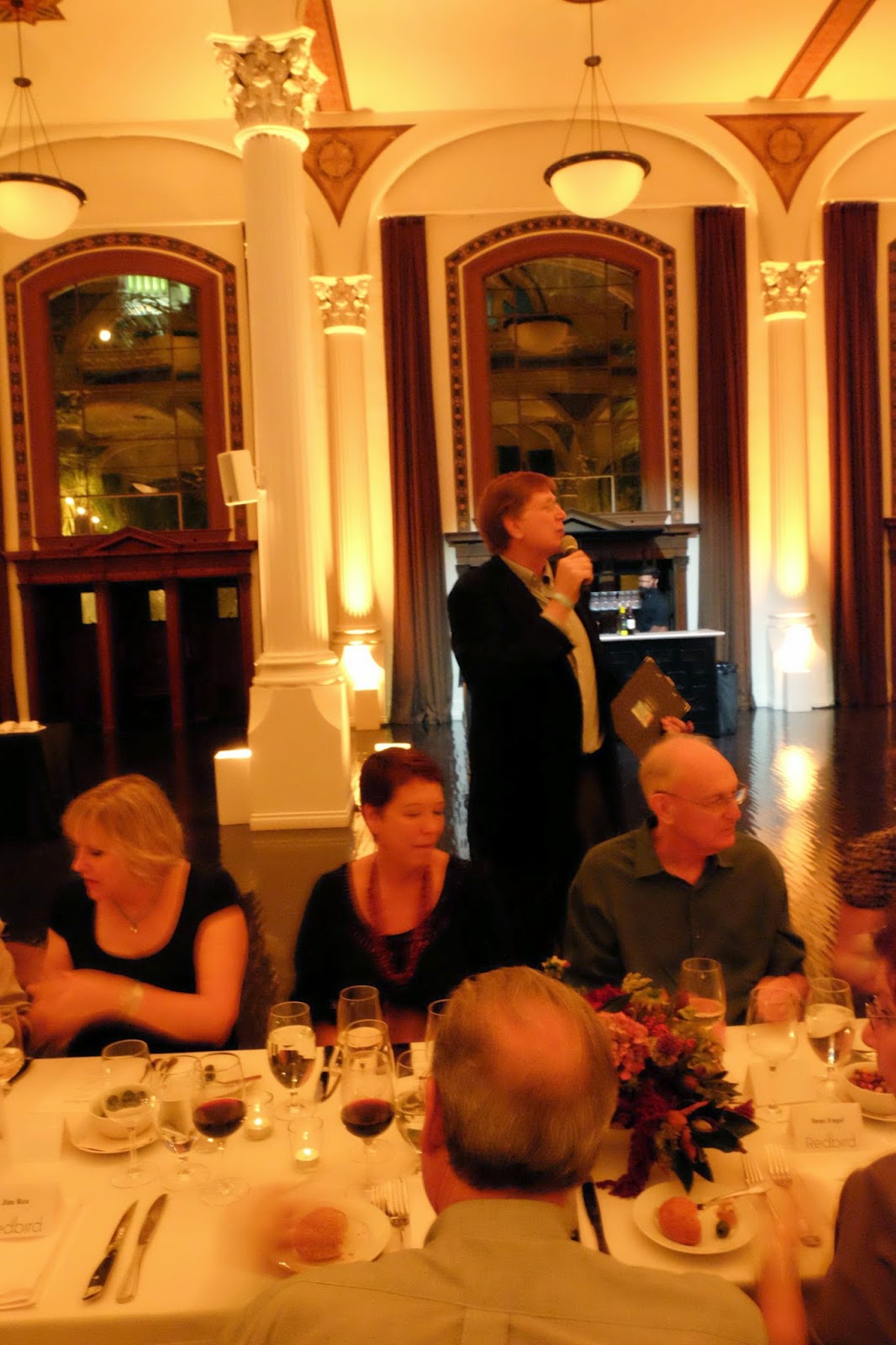The evening opened with wine and hors d’oeuvres in the Vibiana courtyard.  Wine was served from three different distributors (Kiwi Distributing, Guadelupe Wines & Bonny Doon Vineyards) who generously donated their delicious beverages.  Chef Fraser gave the crowd a personal tour of the restaurant (still under construction) and the kitchen before everyone was seated at a single long banquet table.